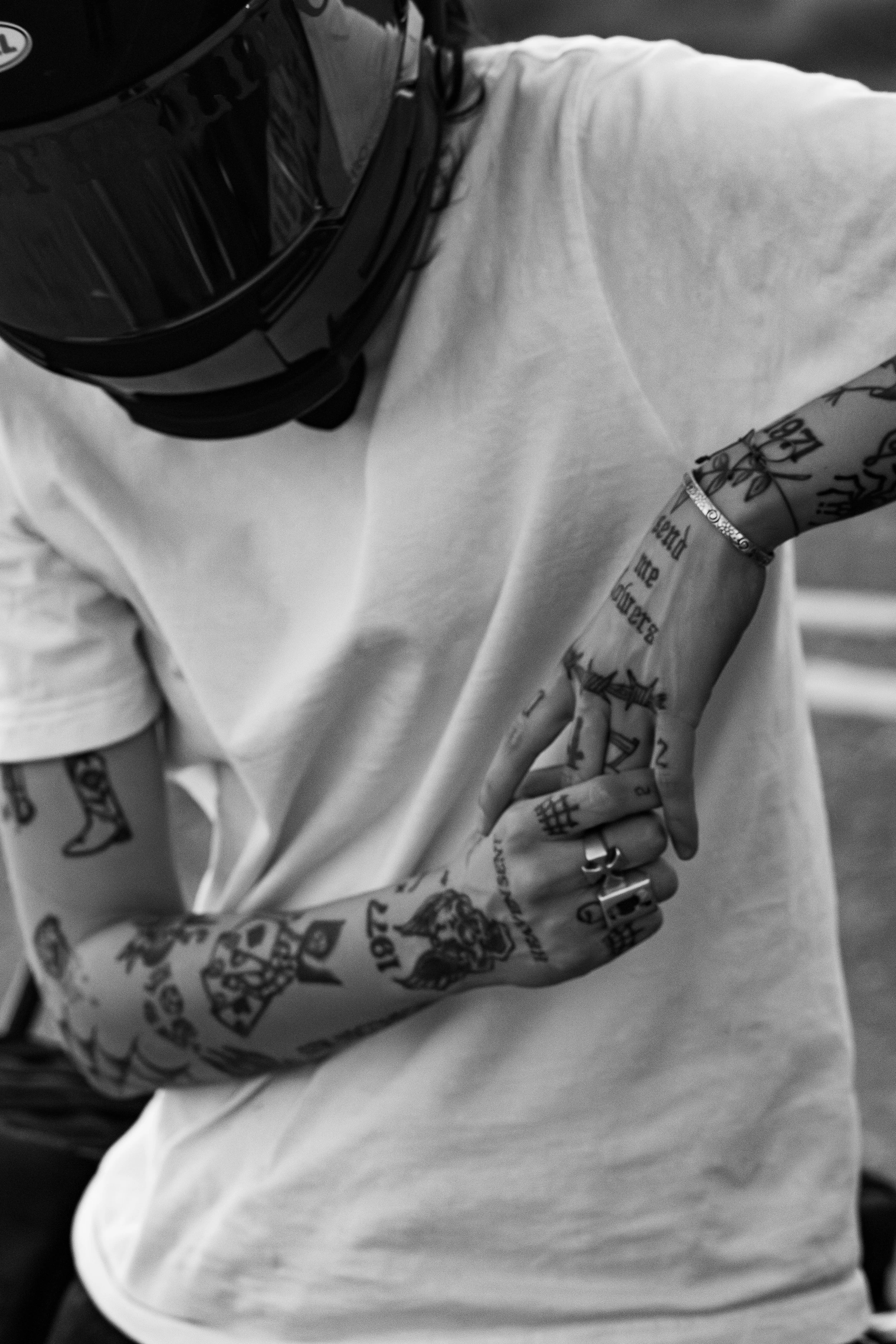 Person wearing a white t-shirt, black helmet with reflective visor, and decorated tattoos on their arm and hand, including various symbols and text, in black and white.