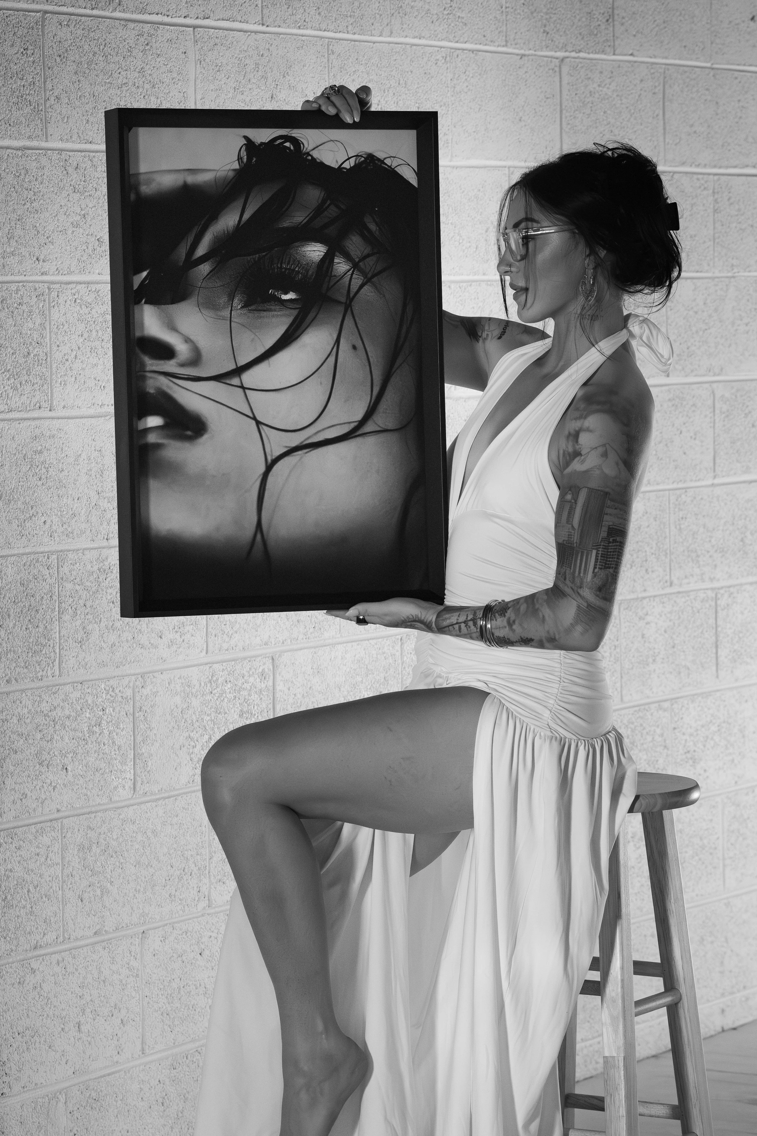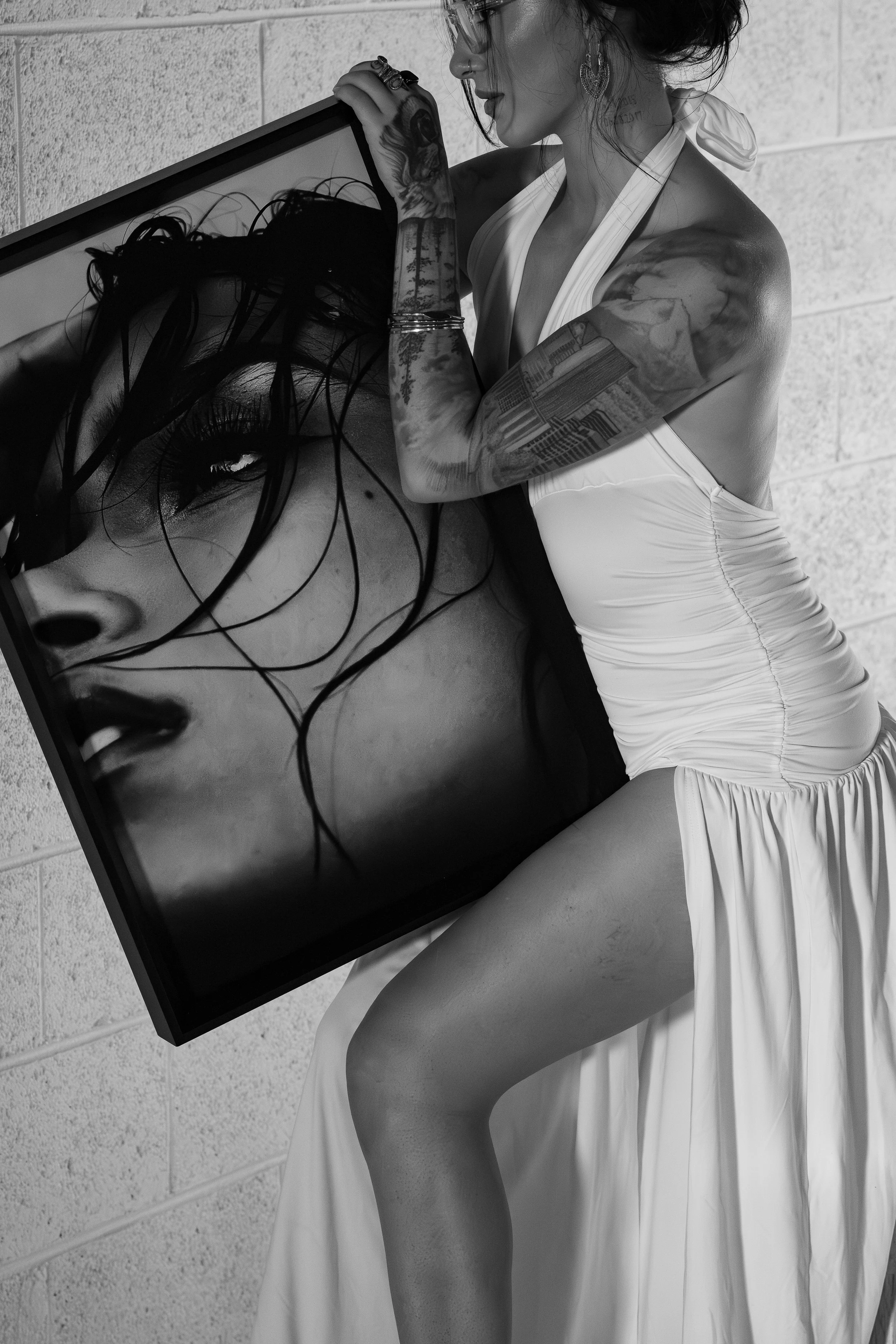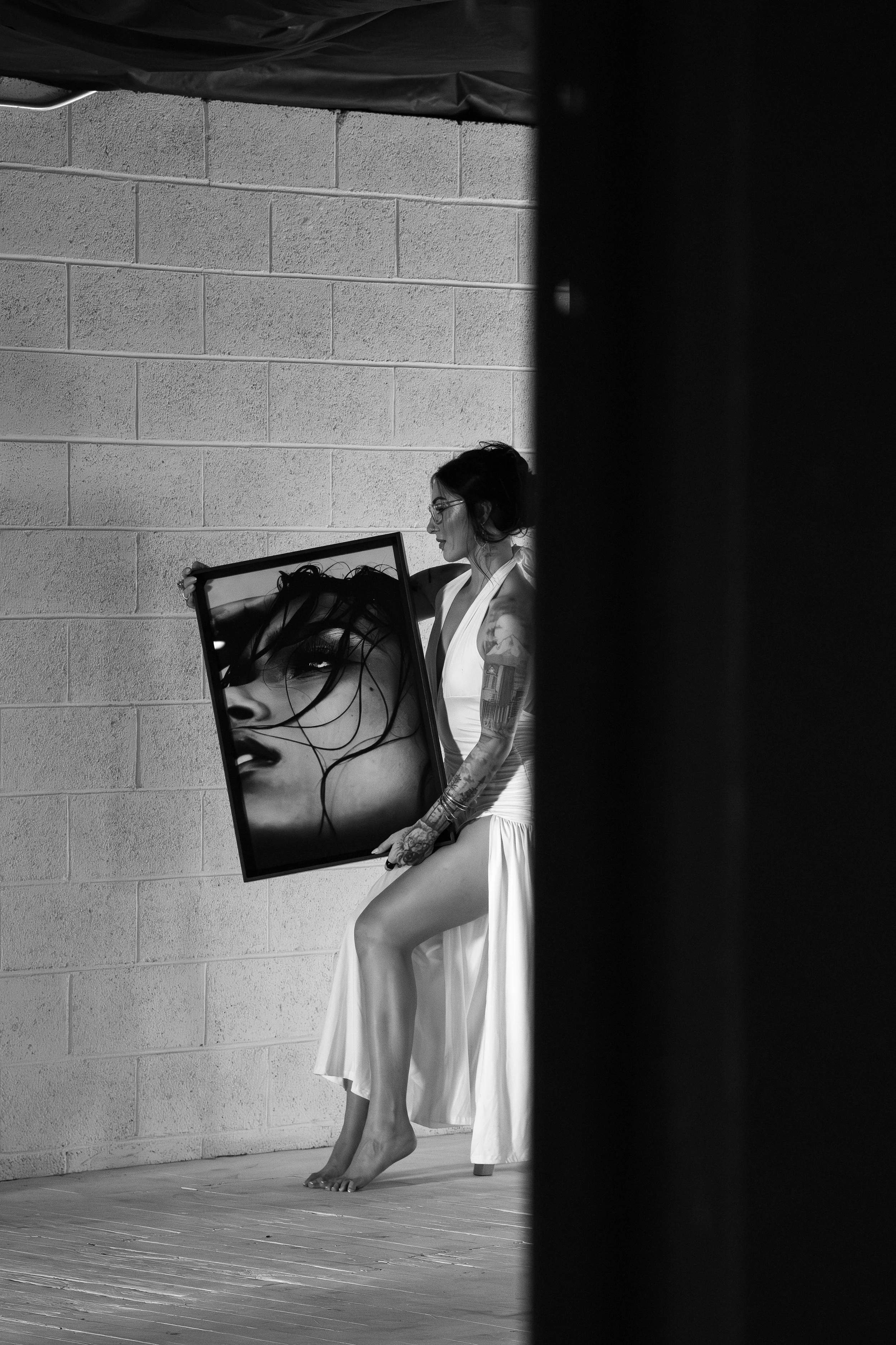 A woman with tattoos wearing a white dress, sitting on a stool, holding a framed photograph of a woman's face with wet hair, against a brick wall background.