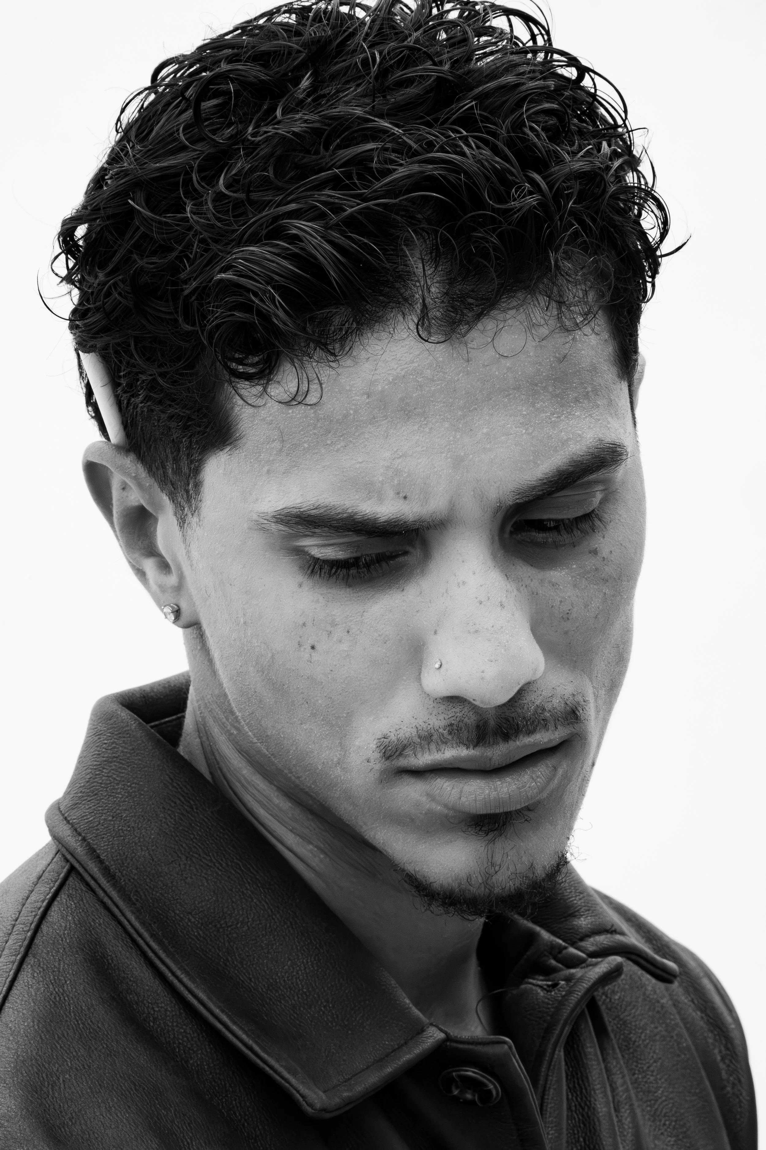 Black and white portrait of a young man with curly hair, earring, and a leather jacket, looking down with a serious expression.