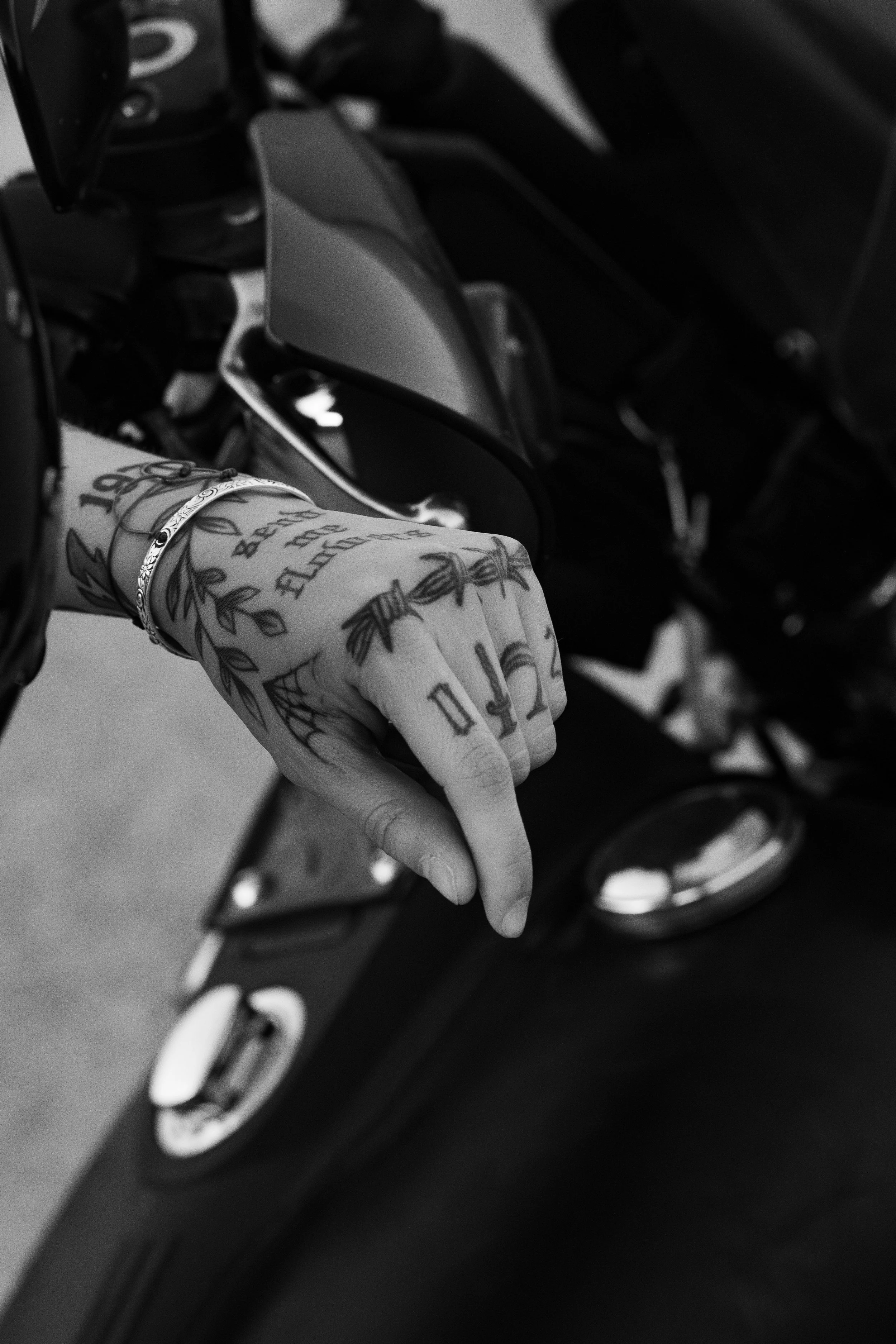 Close-up of a tattooed hand with jewelry, resting on the handlebar of a motorcycle.