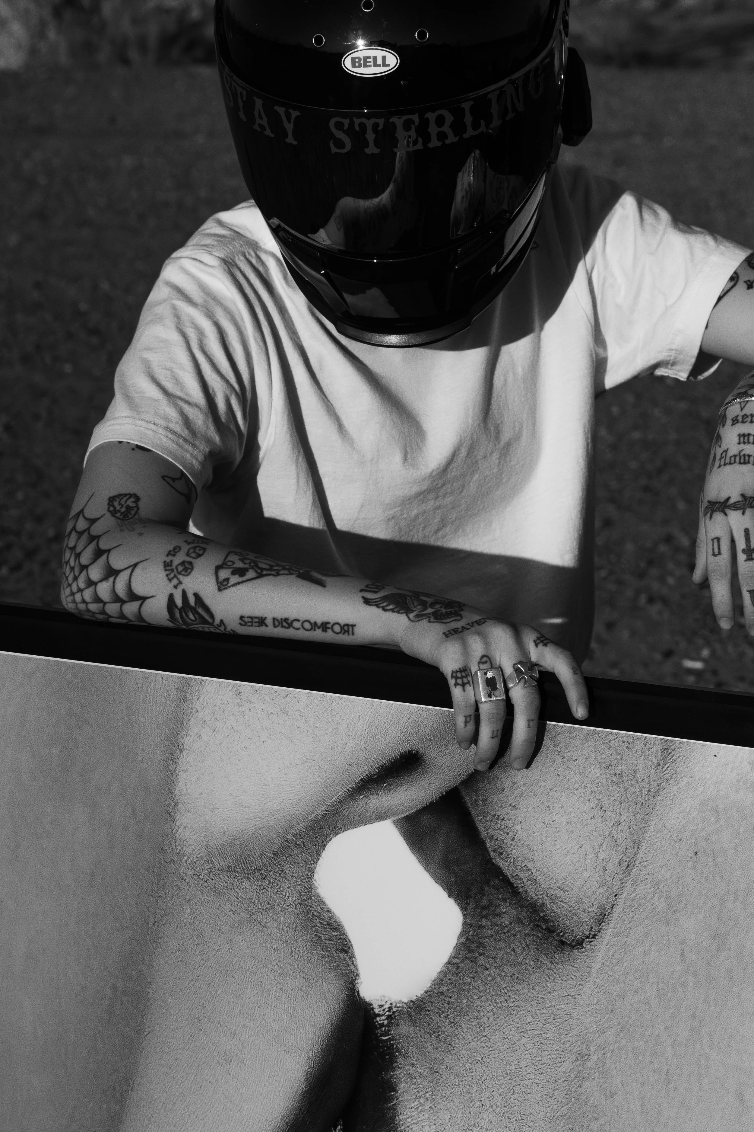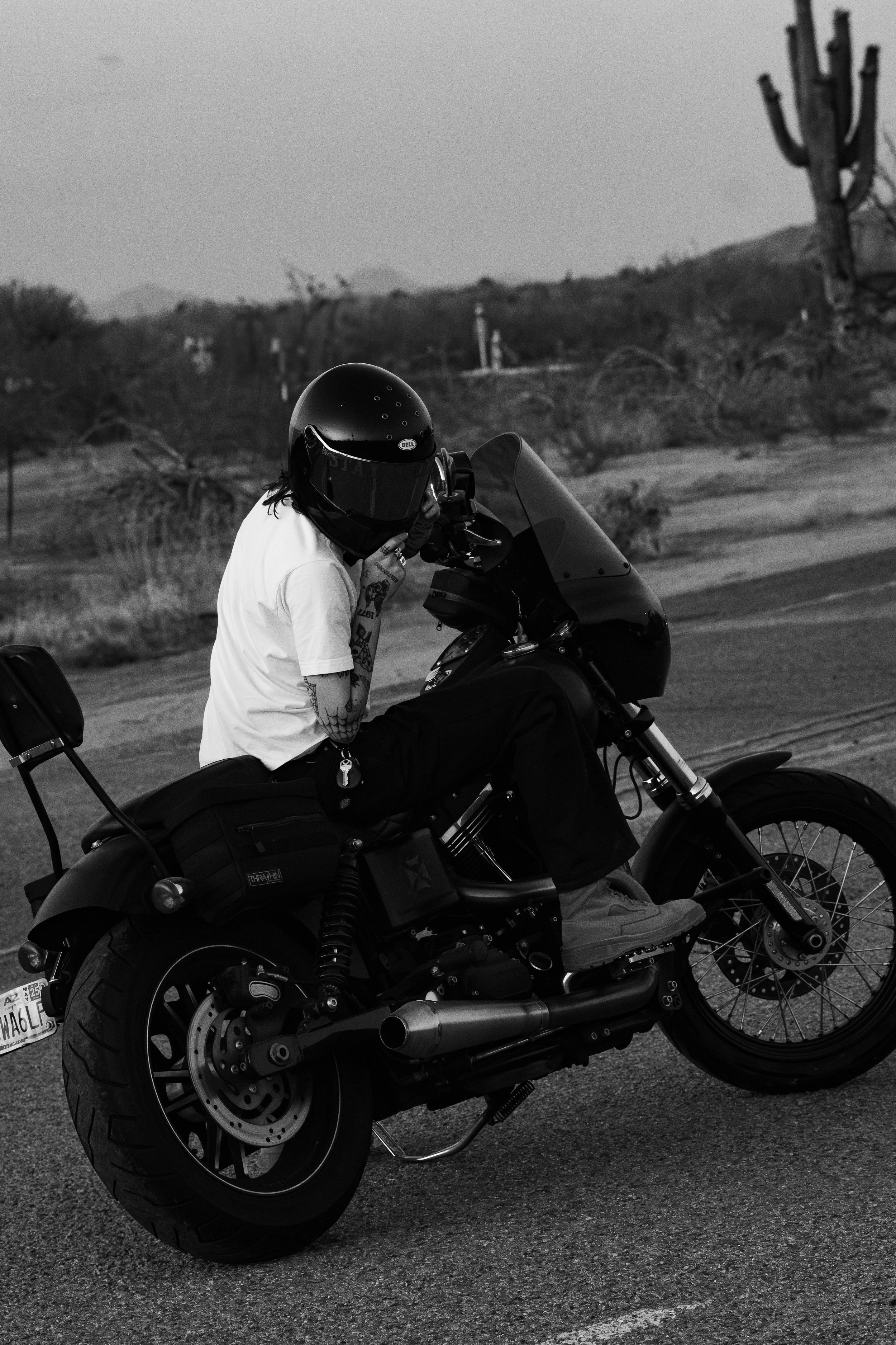 Person wearing a black motorcycle helmet, white t-shirt, and black pants sitting on a motorcycle with tattoos on their arms, in an outdoor setting.
