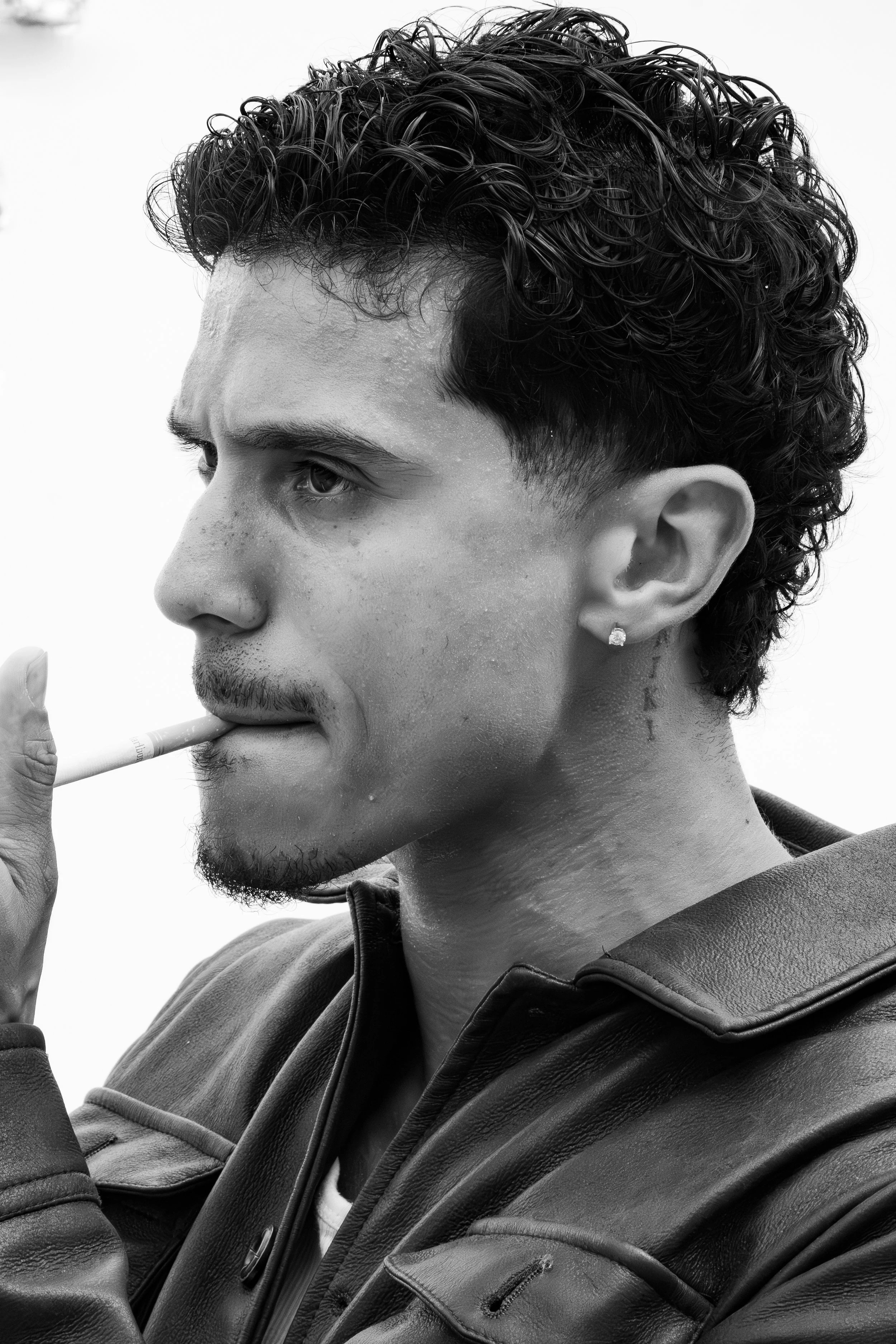 Black and white portrait of a young man with dark curly hair smoking a cigarette, wearing earrings and a leather jacket.