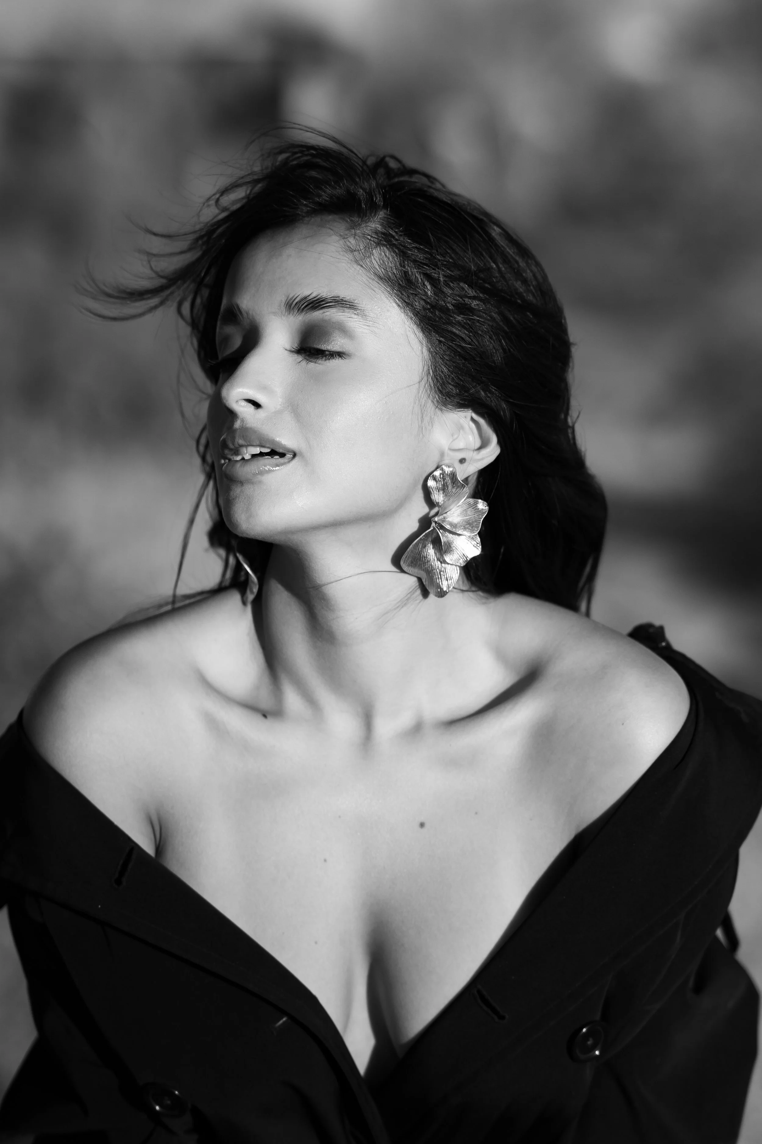 A black-and-white portrait of a woman with dark shoulder-length hair, closed eyes, and a relaxed expression, wearing large flower-shaped earrings and an off-the-shoulder black top.