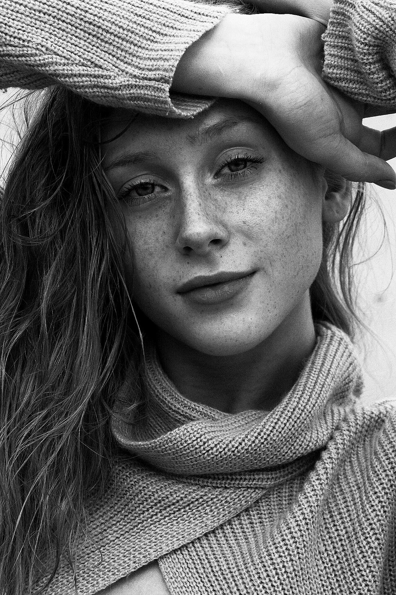 A black-and-white portrait of a young woman with wavy hair, looking at the camera, wearing a knitted sweater and resting her hand on her forehead.
