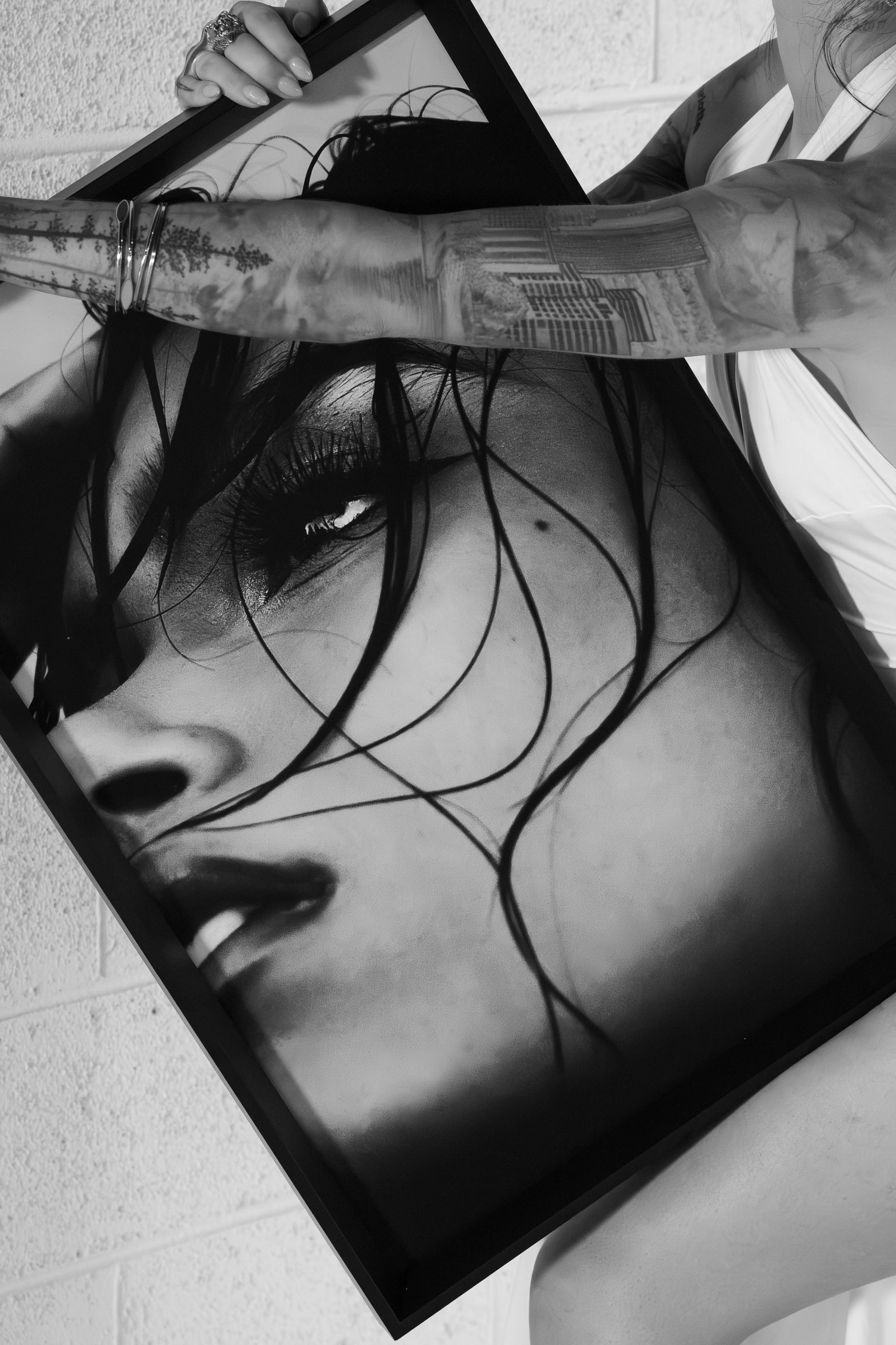 A woman with tattoos and earrings is holding a large framed black-and-white photograph of a woman with wet hair and a partially open mouth, leaning against a textured wall.