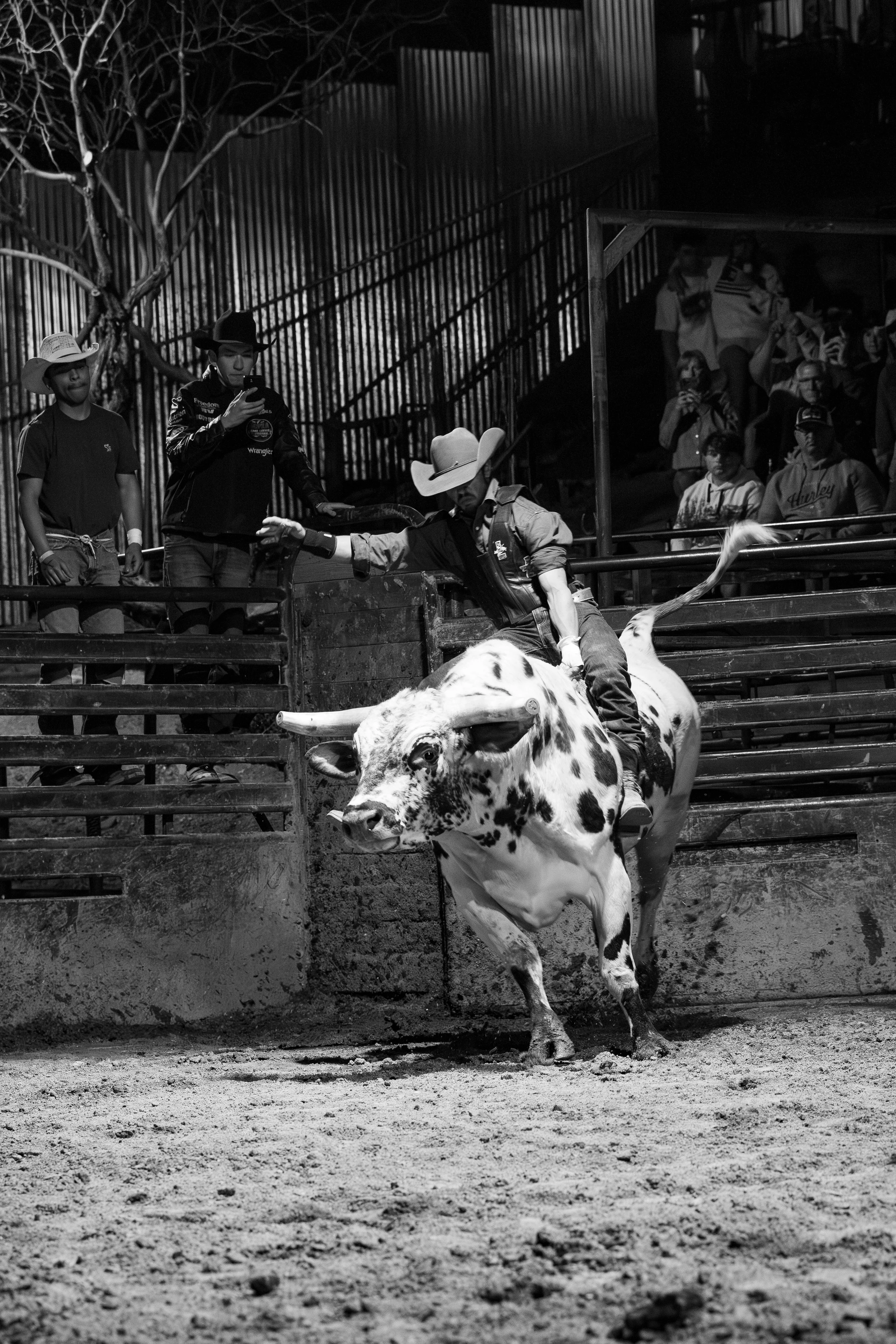 A rodeo scene with a cowboy riding a bouncing bull in an arena at night, with spectators watching.