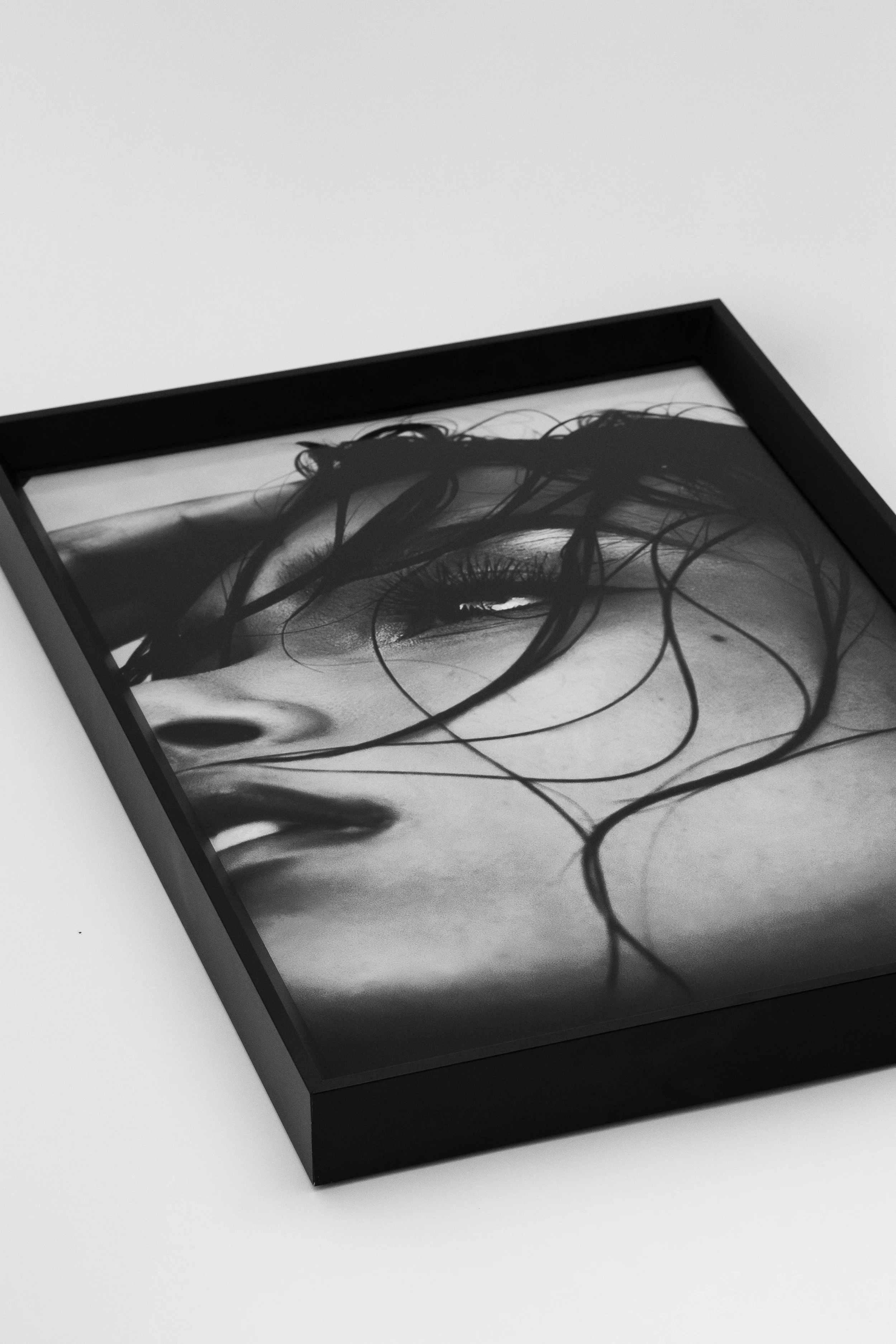 Black and white framed photograph of a woman's face with wet hair partially covering her eye, lying on a white surface.