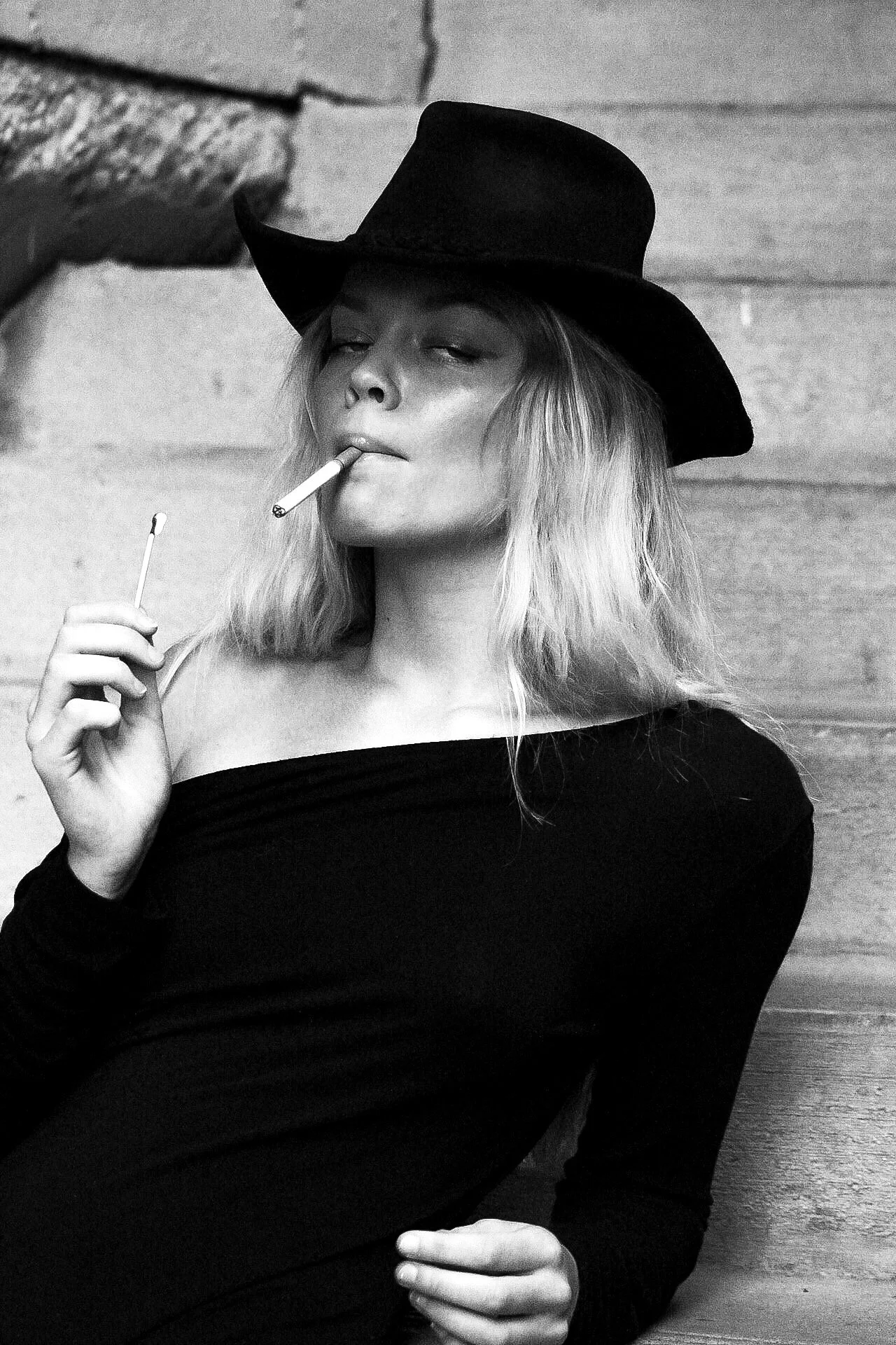Black and white photo of a woman with long blonde hair wearing a wide-brimmed hat, holding a cigarette near her lips, with a relaxed and confident expression.
