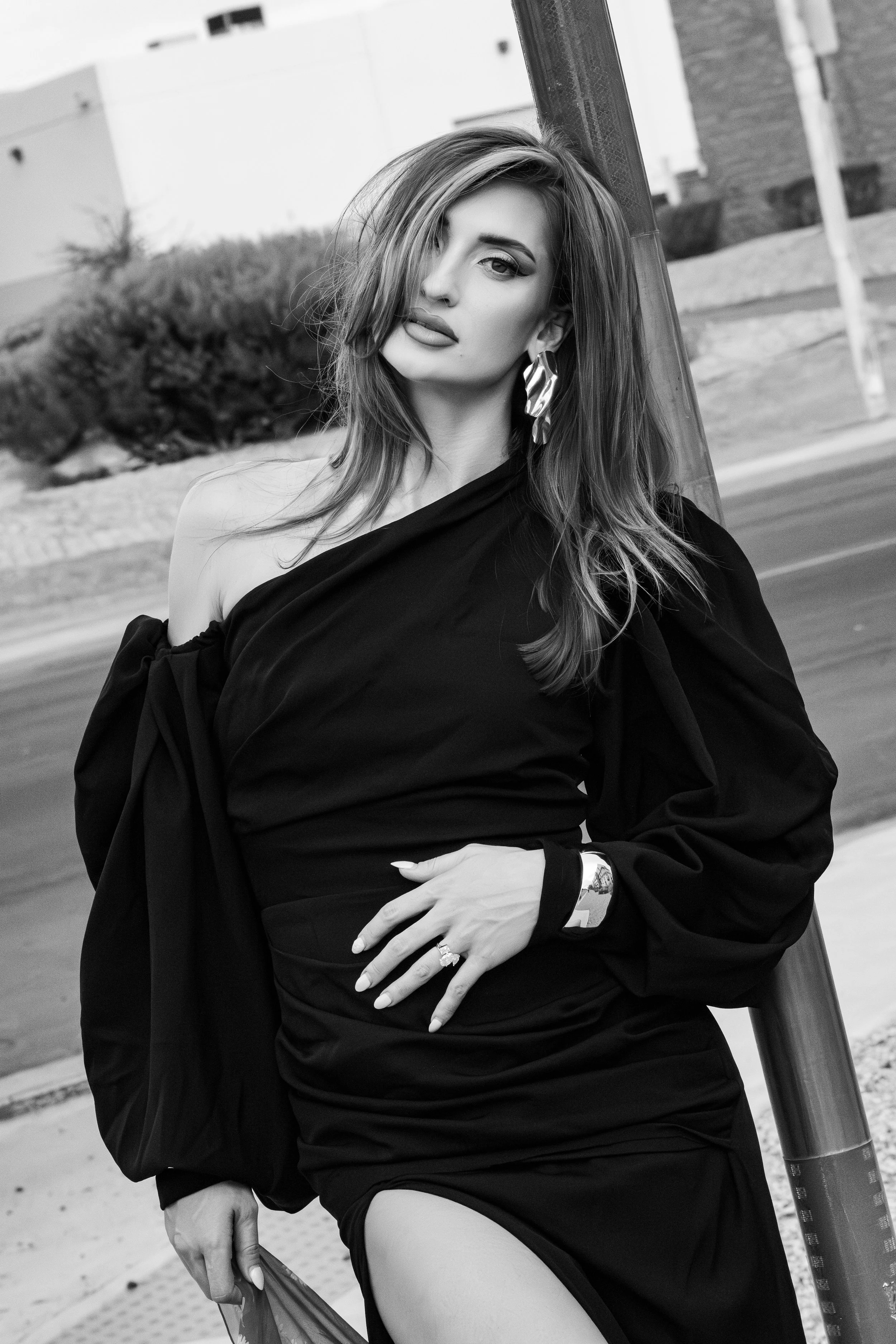 A woman in a black dress with a high slit and floral fabric, posing outdoors next to a street pole in black and white.