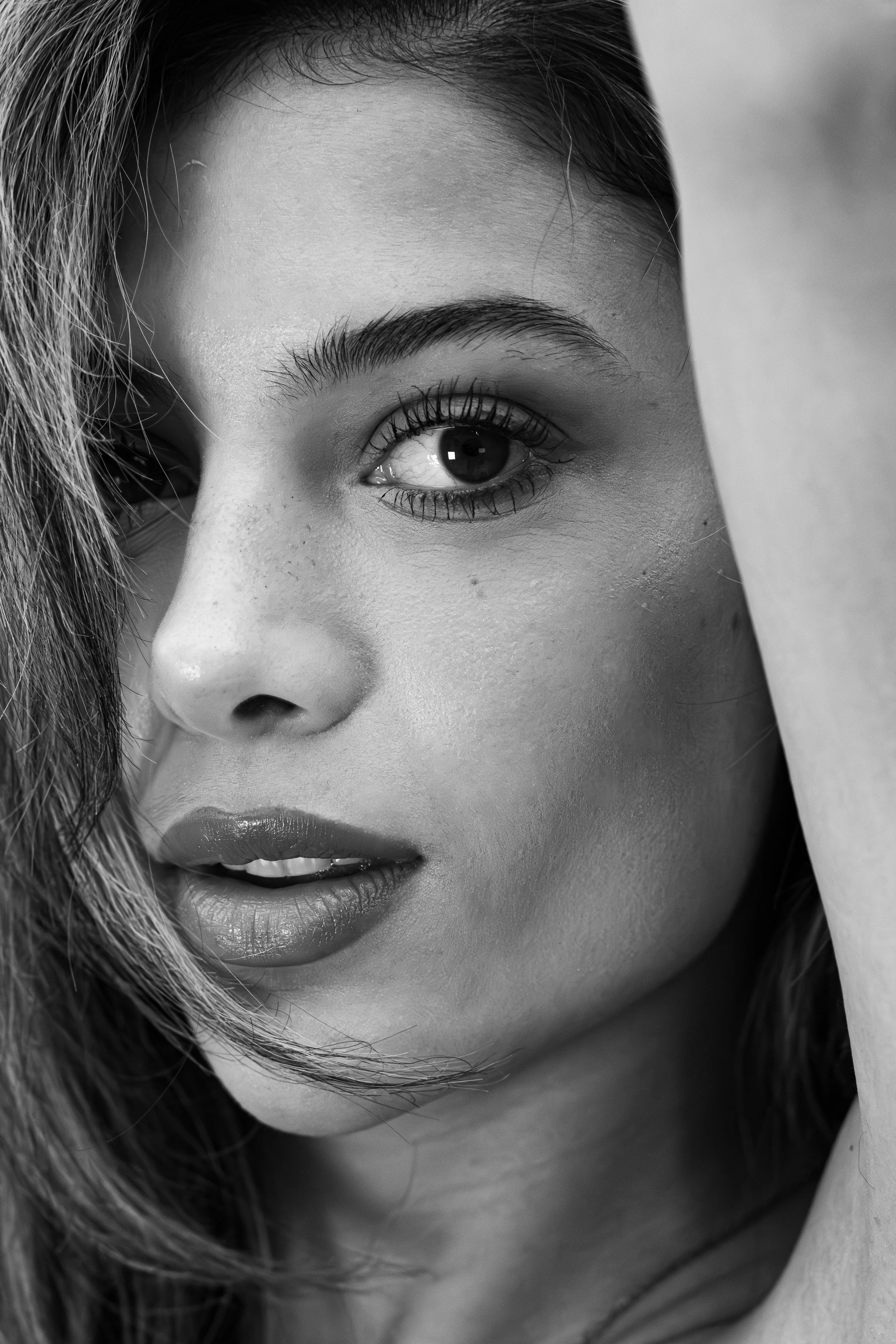 Close-up black and white photo of a woman's face, showing her eye, lips, and part of her hair, with one hand partially covering her face.