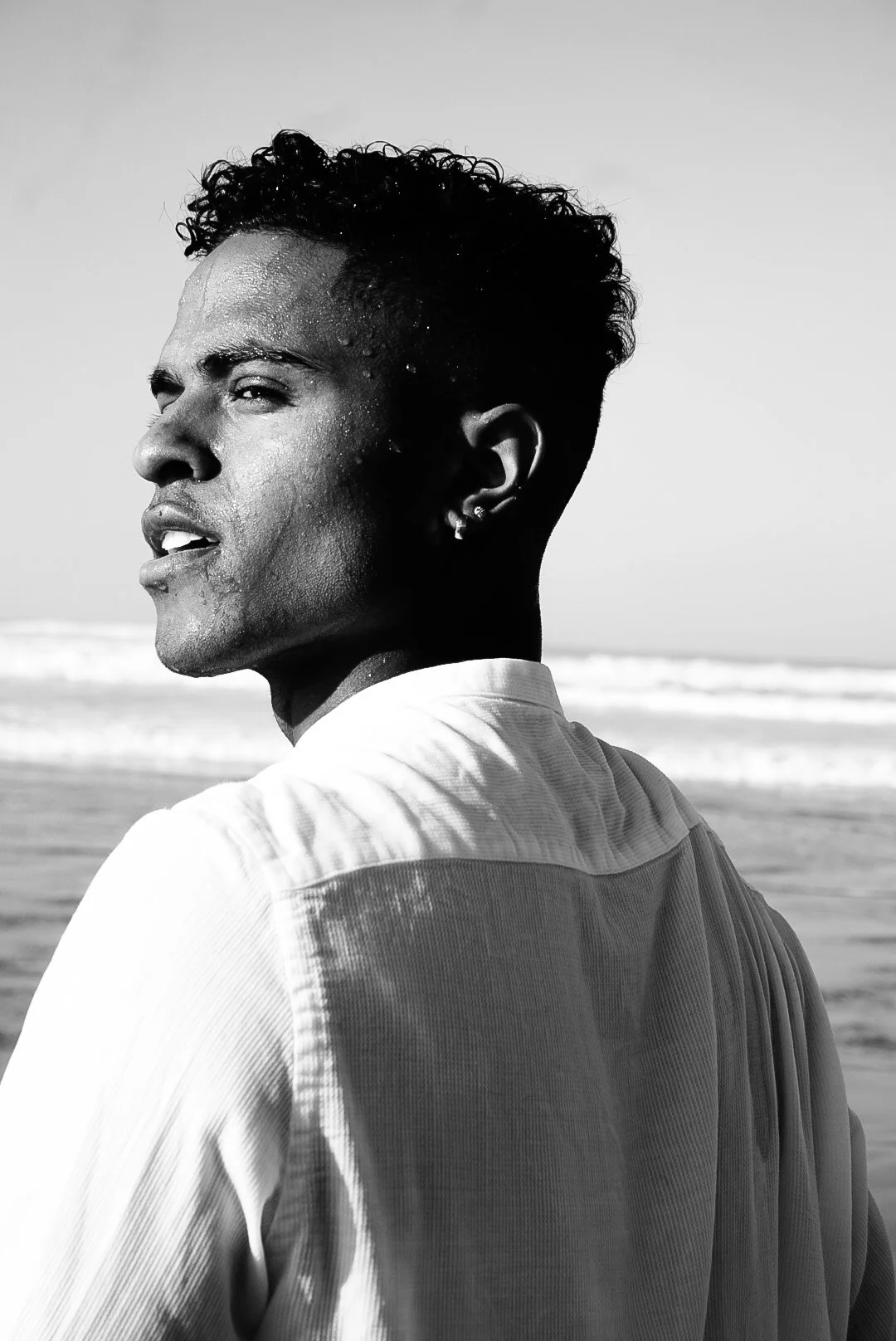A young man with his eyes closed standing by the ocean on a beach, wearing a partially unbuttoned shirt, in black and white.