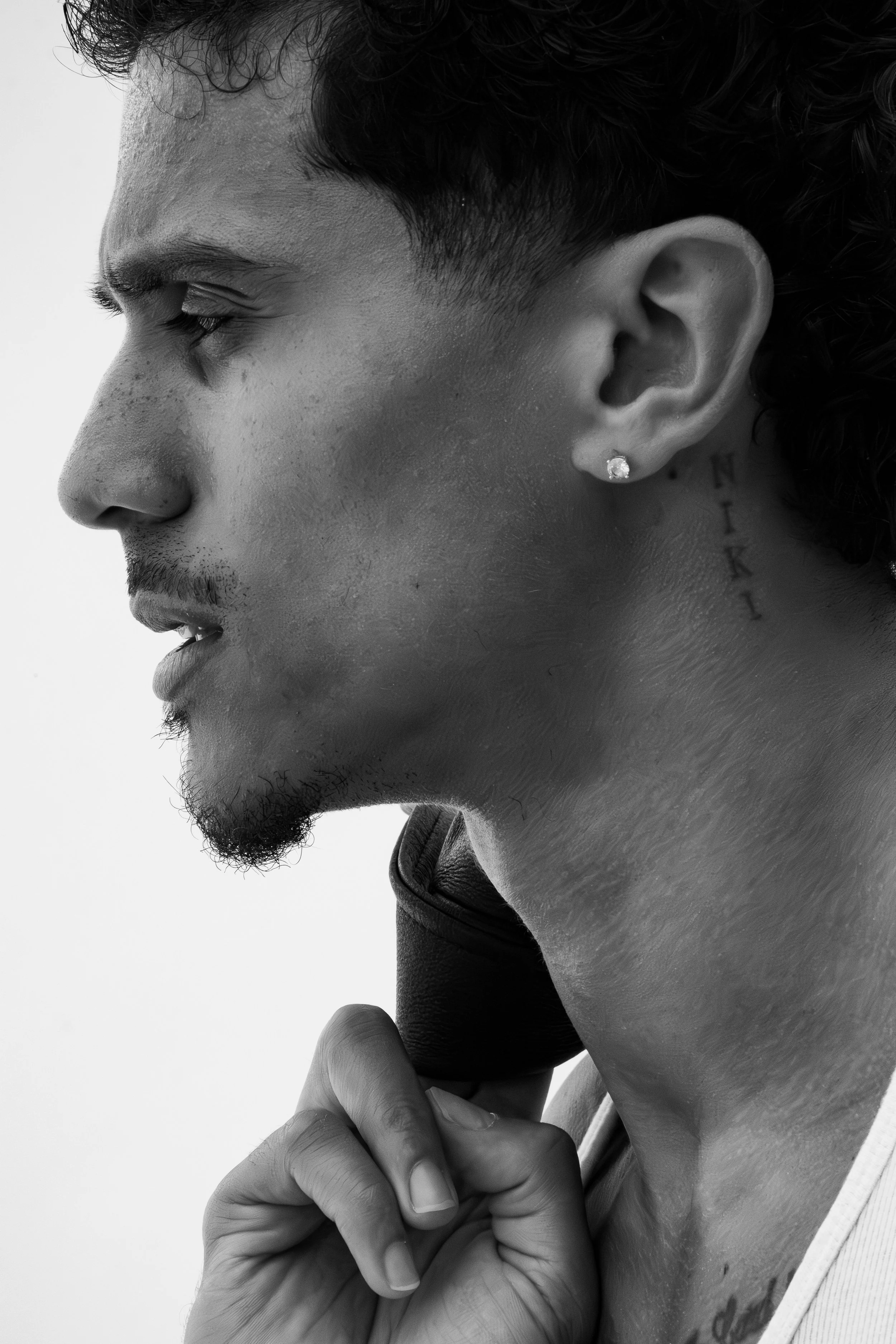 A black and white close-up side profile of a man with tattoos, earrings, and curly hair, holding a microphone near his neck.