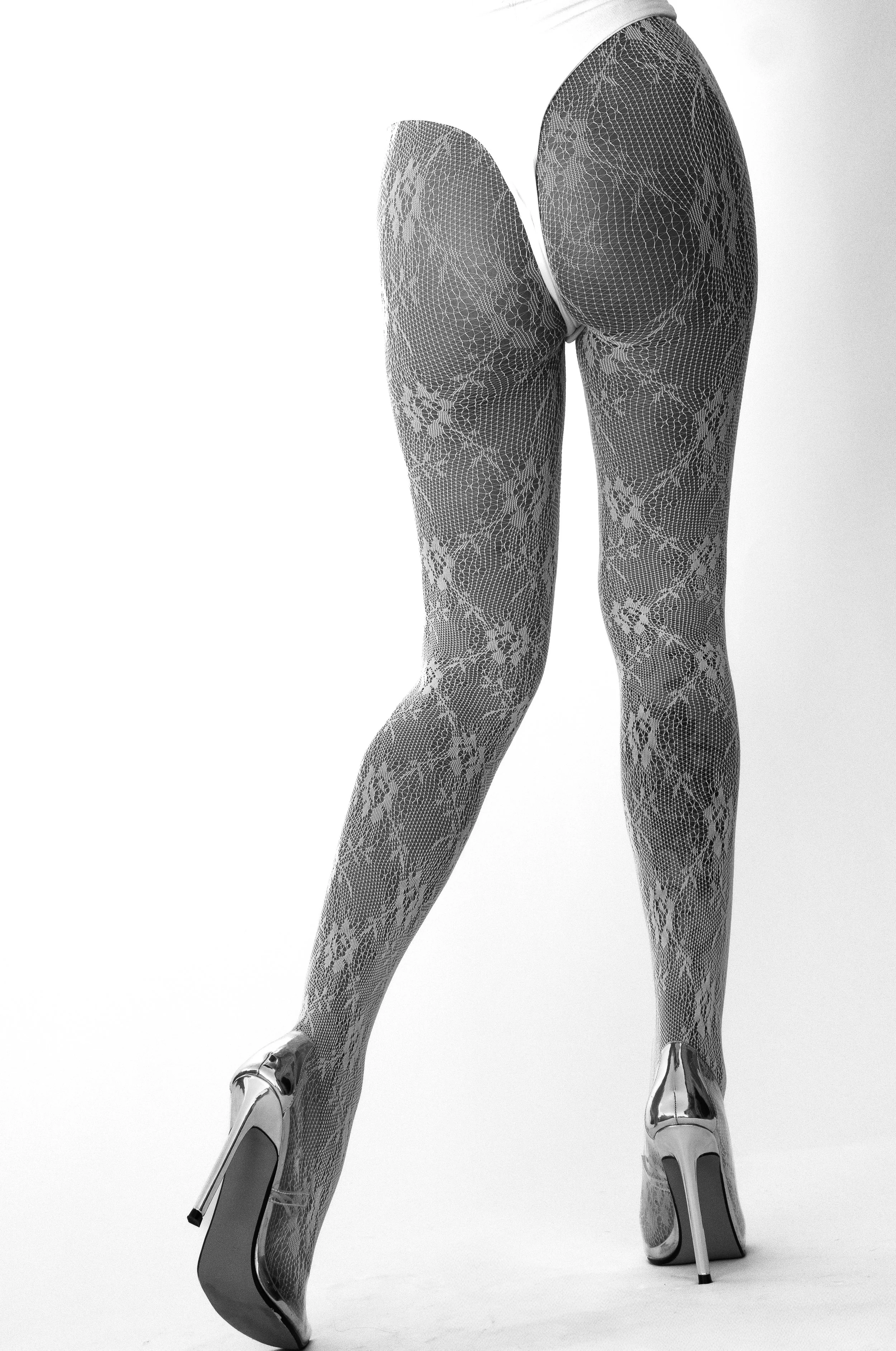 Close-up of a woman's legs wearing patterned lace tights and high heels against a white background.